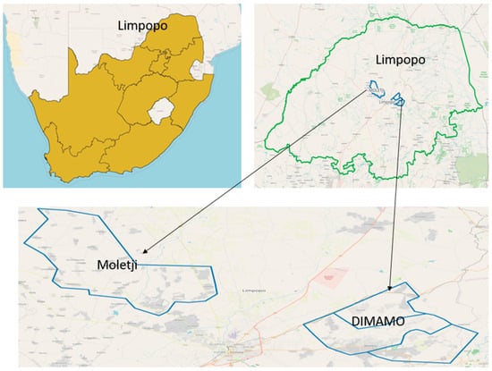 The study population included caregivers and children aged 3 to 12 months residing in villages that fall under two tribal authorities, namely, Moletji and DIMAMO, which are in the Polokwane municipality of the Limpopo Province (Figure 2). According to clinic registers and the DIMAMO population demographics and surveillance system, there were approximately 158 and 146 children aged 3 to 12 months in the Moletji and DIMAMO tribal authorities, respectively. Therefore, 304 was regarded as the population size. For this study, ‘caregiver’ refers to the legal guardian of the child, who were mostly (97.9%) the biological mother of the child. The study was limited to caregivers who were at least 18 years old, spoke Sepedi and English, and were able to give informed consent. The sample size from an estimated population of 304 children was determined using Slovin’s formula [12] (Slovin, 1960 [13]): n = N/(1 − Ne2), where n is the sample size, N is the population size, and e is the acceptable margin of error (0.05). With 10% attrition added, the sample size was 171, for 189 caregivers.