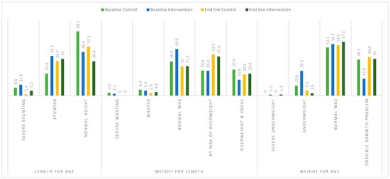 Figure 3: At baseline, there were no significant differences in length for age (p = 0.108) and weight for length (p = 0.451) of infants in the two groups. However, weight for age differed significantly between intervention and control groups (p = 0.017), where more than a quarter of infants in the experiment group were underweight as compared to the control group (26.3% versus 10.6%). Post-intervention: no significant changes in length-for-age Z-scores (LAZ), weight-for-age Z-scores (WAZ), and weight-for-length Z-scores (WLZ). However, severe stunting reduced from 11.6% to 5.2% in the intervention group (difference of 6.4%), stunting reduced from 42.1% to 39% (difference of 3.1%), while underweight reduced from 26.3% to 2.6% (difference of 23.7%) as compared to the control group. Detailed results are further presented in the Supplementary File (Table S2).