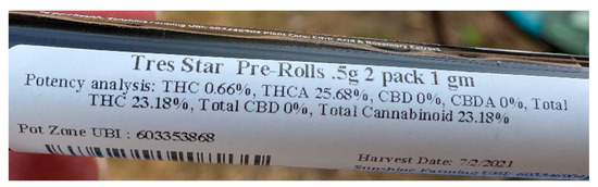 Potency information was obtained from submitted cannabis packaging. Cannabis package labeling is regulated by WA State, requiring net weight, trade name, and concentration of THC, THCA, and/or Total THC and CBD, CBDA, and/or Total CBD (see Figure 1 for an example). THCA and CBDA are cannabinoids converted to THC and CBD via exposure to heat, resulting in decarboxylation. This process is only 87.7% efficient; thus, the formula to compute Total THC% and Total CBD% are shown in Equations (2) and (3) [20].