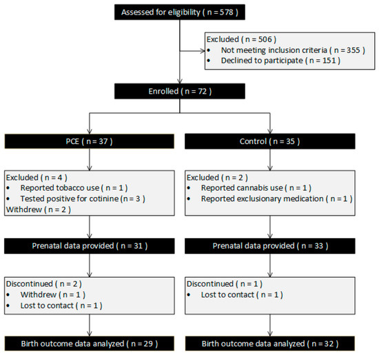 Of the N = 72 participants enrolled, 31 PCE and 33 controls provided usable data. Details on the recruitment and retention of the study cohort are diagramed in Figure 2, and cohort demographics and pregnancy risk factors are detailed in Table 1. Demographics further segregated by infant sex are detailed in Appendix A Table A1. Research visits were conducted at 17.0 (6.7)-, 27.0 (2.9)-, and 37.8 (0.6)-weeks’ gestation (mean (SD)).