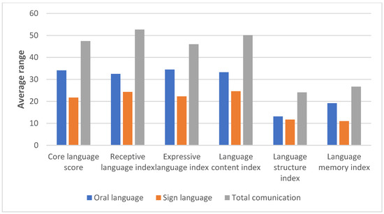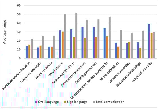 Figure 1 shows the average range assigned to each group in the Kruskal–Wallis test. This allows for the verification of which communicative modality has, on average, higher or lower values in relation to the other modalities. Children using the total communicative modality obtained the highest scores in all subtests, apart from the pragmatics profile where the scores of children using oral language were higher. The linguistic performance of children with this communicative modality follows that of those using total communication. The lowest performance corresponds to those using sign language, although in the subtests of sentence comprehension, linguistic concepts, word structure, and word classes, the differences with the oral modality are not so marked.