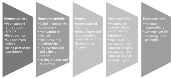 - Leamy, M.; Bird, V.; Le Boutillier, C.; Williams, J.; Slade, M. Conceptual Framework for Personal Recovery in Mental Health: Systematic Review and Narrative Synthesis. Br. J. Psychiatry 2011, 199, 445–452. [Google Scholar] [CrossRef]