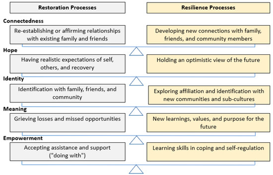 While traditional population-based strategies have prioritised promoting wellbeing, these approaches often lack the specificity required for youth recovering from mental health concerns [5]. For example, the quality of relationships significantly affects youth coping and wellbeing [6] but youth with mental health concerns often face unique challenges in initiating and maintaining relationships and are more susceptible to social isolation [7]. The CHIME framework has shown efficacy in many adult recovery applications. However, research has shown that when applied to youth recovery a more developmentally appropriate and ecological view is required [32,33,34,35]. A recent youth recovery conceptualisation (see Figure 2; [32]) has assessed the importance of existing frameworks including CHIME and through multisystemic analysis identified additional processes of restoration and resilience. These additional processes note that connectedness includes the restoration of relationships as well as the development of new connections related to mental health and healthy identity development.