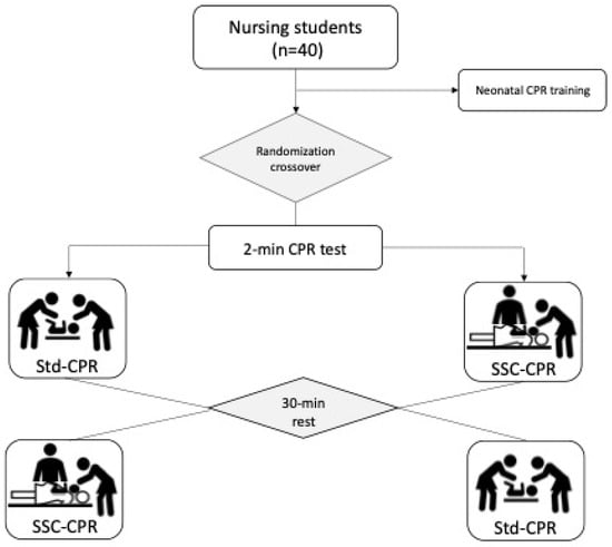 Flow chart and design. CPR: cardiopulmonary resuscitation; SSC-CPR: skin-to-skin contact cardiopulmonary resuscitation; Std-CPR: standard cardiopulmonary resuscitation.