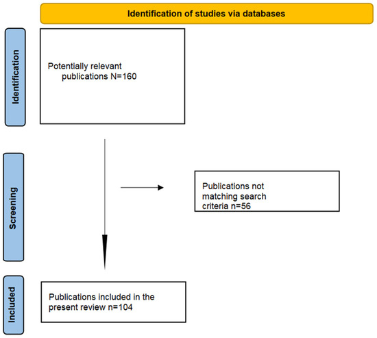 This study was conducted using the major scientific platforms, such as Web of Science, PubMed, and Scopus in the period between August and October 2024. For the bibliographic search, the keywords used were the following: “breastfeeding”, “human milk oligosaccharides”, and/or “microbiota–gut–brain axis”, and/or “infants”, and/or “malnutrition”. In our review, we include original papers and include the most recent papers. The inclusion criteria in our study were (i) original research papers that focus on HM, (ii) human and/or animal studies that focus on the health benefits in the microbial environment in HM, and the gap with IF for neurodevelopment in newborn (iii) meta-analyses. The exclusion criteria were the following: (i) case reports, (ii) commentaries, and (iii) articles that were not in English. Through the established search strategy, 160 articles were found, of which 104 were relevant and included in this article. A flow diagram of the selection process is shown in Figure 1.