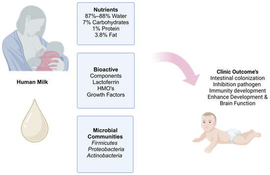 However, the presence of microorganisms in breast milk, as well as in our intestine, seems to depend strongly on the mother’s health, her diet, and the use of antibiotics during breastfeeding. Solo et al. demonstrated that, in a cohort of healthy women (n = 160) subjected to antibiotic therapy, there was a reduction in Bifidobacteria (important because they are able to ferment HMOs). It is also known that the maternal body mass index (BMI) before and during pregnancy can influence not only the health status of the newborn but also the microbial composition of the milk. Reduced microbial biodiversity has been observed in women with a high BMI (overweight/obesity), starting from the composition of the colostrum [53]. However, further studies are needed to better understand the mechanisms of transmission between the gut–mammary gland and human milk.