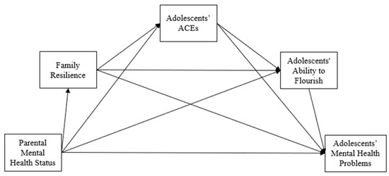 3.3. Hypothesis Testing for the Mediating Effects of Family Resilience, Adolescents’ ACEs, and Their Ability to Flourish in the Intergenerational Transmission of Mental Health (H2)