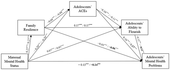| Maternal MH → family resilience → flourish → adolescent MHP | −0.005 *** (−0.006, −0.005) | −0.006 *** (−0.006, −0.005) |