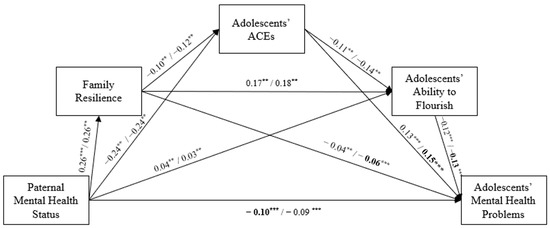 | Paternal MH → family resilience → ACES → flourish → adolescent MHP | 0.000 *** (0.000, 0.000) | −0.001 *** (−0.001, 0.000) |