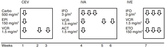 CWS 2009 protocols, CEVAIE regimen. Carbo = carboplatin; EPI = epirubicin; VCR = vincristine; IFO = ifosfamide (associated with Mesna); ACT = actinomycin; D; ETO = etoposide.