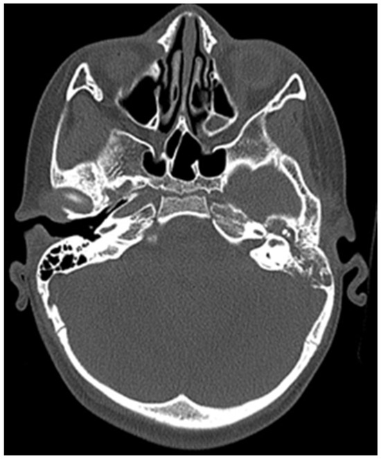 After these CT findings, an examination by an ENT specialist was performed—left external auditory canal was completely obstructed by a soft tissue formation, which resembles granulation tissue, left tympanic membrane was impossible for observation. Second diagnosis was established—peripheral facial nerve palsy, caused by middle ear chronic inflammation. So the patient was transferred to an ENT clinic for surgical treatment.