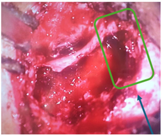 A surgical intervention was performed—radical trepanation. It started with retroauricular incision and mastoid bone exposure. As we started drilling of the mastoid bone, there was a destruction of the normal mastoid bone structure by a soft tissue mass, which was filling the entire mastoid beneath the cortex. The aditus was also blocked by that soft tissue. Following the destruction in a cranial direction, there was a 3 cm zone of exposed durra matter (Figure 4). After removing of the posterior wall of the external auditory channel, there was a large defect (Figure 5), through which the soft tissue was spreading from the mastoid to the external auditory channel. Step by step a classical radical trepanation cavity was formed. Tympanic membrane and ossicular chain remnants were visualized and removed. During the inspection of the tympanic cavity, a small tumour mass, which causes profuse bleeding if touched, was found in the area of the Eustachian tube hole. Intraoperative frozen section biopsies of the other soft tissue masses were all negative for malignant tumour cells and because of that, a decision for postoperative MRI around 30 days after the surgery was taken to clarify the surgical finding.