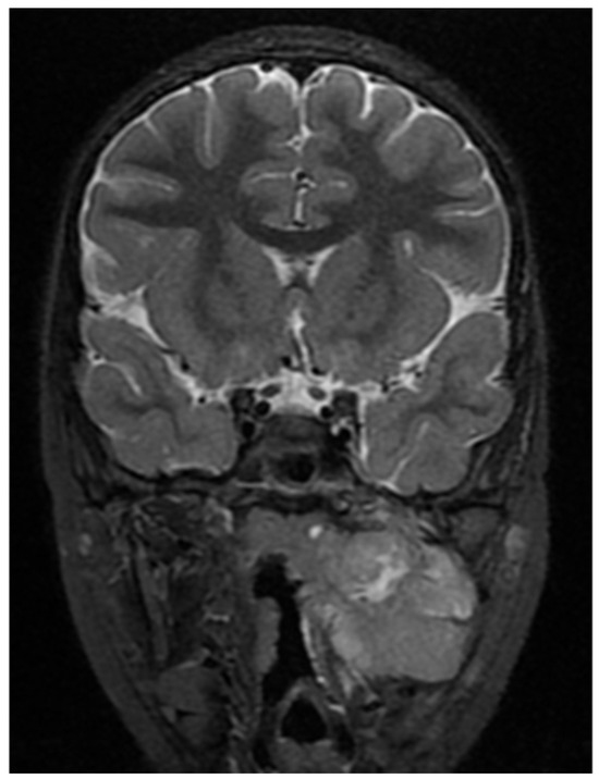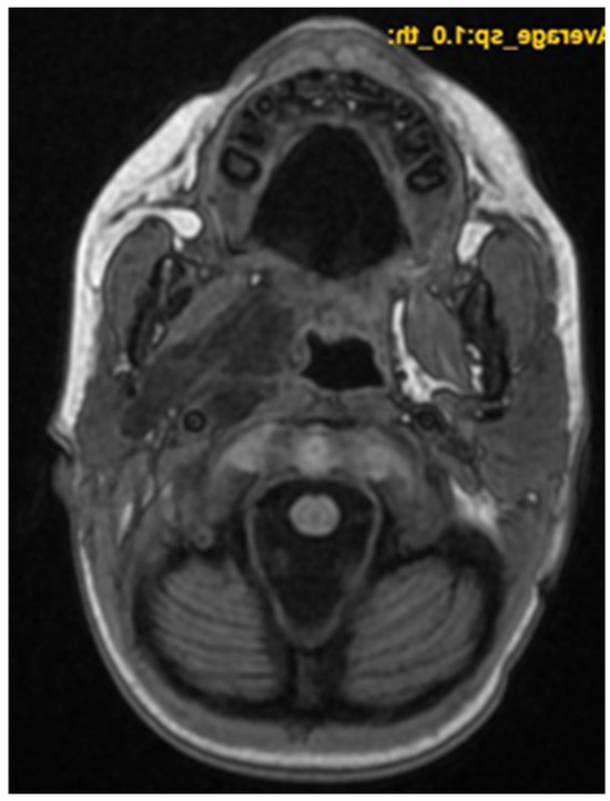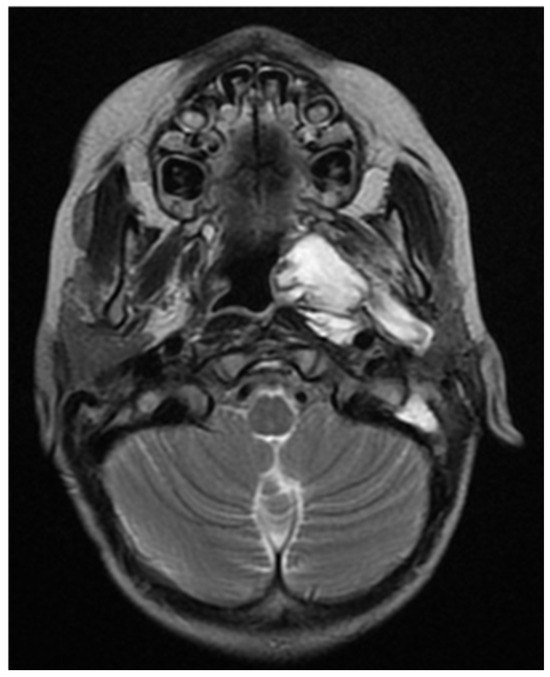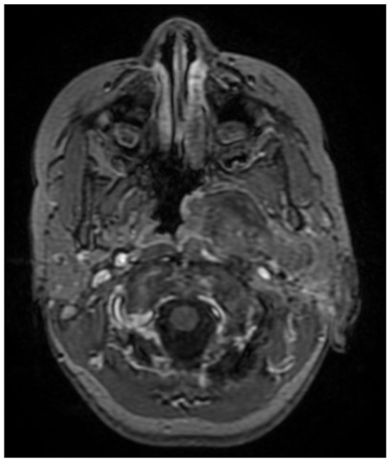 A CNS MRI was performed, which reveal a large lobulated formation in the oropharynx and nasopharynx with left tonsil involvement, spreading to the retropharyngeal space and propagating through the left Eustachian tube into the middle ear. The previously formed surgical cavity was completely infiltrated from the soft tissue tumour mass. Approximate dimensions of the lesion in the mastoid—25/45 mm. axial, 38/39 mm. coronal (Figure 6, Figure 7 and Figure 8).