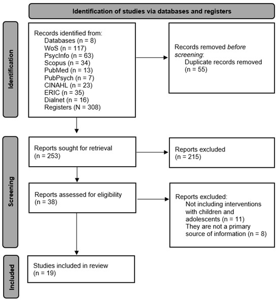 An initial search yielded 308 results. Regarding the databases in which they were found, 117 appeared in WoS, 63 in PsycInfo, 34 in Scopus, 13 in PubMed, 7 in PubPsych, 23 in CINAHL, 35 in ERIC and 16 in Dialnet. Of them, 55 records appeared in more than one database, so they were eliminated by considering them duplicate. Inclusion and exlusion criteria were applied after reading the abstract. The studies that did not meet the criteria were removed, and during the screening phase, 215 records were eliminated for being irrelevant or not meeting the eligibility criteria. As a result, only 38 documents remained. These were subjected to a more detailed assessment, and ultimately, only 19 studies were deemed suitable for inclusion in the systematic review. The main reasons for discarding documents were, firstly, that they did not involve interventions with children and adolescents. They focused on family or therapist perspectives gathered through questionnaires or interviews instead. Secondly, they were excluded as they were systematic reviews or meta-analyses, which are not considered a primary source of information. The search process and the number of documents identified in each database are presented in Figure 1.