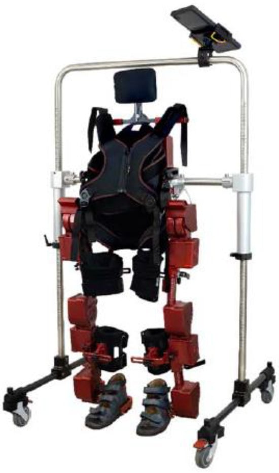 ATLAS 2030 (Marsi Bionics S.L., Madrid, Spain) is an overground pediatric robotic device for gait training [] (Figure 1). Specifically, it is the only commercially available fully portable pediatric robotic gait device, since other similar devices on the market are fixed, use a treadmill, or need external adaptations such as weight support devices [,,]. This device is CE-cleared for use in children with CP and SMA. These two conditions provoke different motor symptoms, since CP usually causes spasticity [,], whereas SMA courses with hypotonia []. However, they result in similar levels of disability, since they both lead to restrictions of the range of motion, weakness, and an impaired walking capacity, affecting social interaction and quality of life.