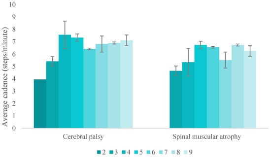 The overall usage time of the device was 44.3 h divided into 52 sessions. Usage time per visit (excluding visit 1, given the adaptation process needed for this first session) ranged from 39.6 min to 60 min, with a mean of 57.3 ± 7.0 min for CP and 53.5 ± 12.0 min for SMA. The overall number of steps was 5454, and the average number of steps per visit for participants with CP was 120.8 ± 32.7 and 106.4 ± 43.2 for participants with SMA. At visit 1, where participants used the device for the first time, an average of 80.5 steps were taken. Nevertheless, at the last session (V9), participants walked an average of 133.67 steps. On average, participants walked 909.0 ± 94.2 steps across the study, with a range from 786 to 1023 steps. The average cadence was 6.3 ± 1.4 steps per minute. Cadence progression across sessions classified by disease can be observed in Figure 2.