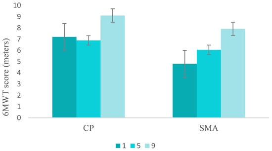 Average meters walked in the 6MWT by pathology and visits (1, 5, and 9). Error bars show one standard deviation. CP: Cerebral Palsy; SMA: Spinal Muscular Atrophy.