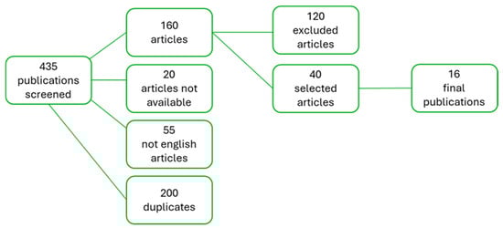 In total, we found 435 records through database searches. The first step involved excluding 55 articles in languages other than English, 20 records with unavailable related articles, and 200 duplicate papers. In the second step, we removed 120 records based on title and abstract evaluation, as they did not meet the inclusion criteria outlined earlier. Of the remaining 40 studies, 24 were excluded after further discussion regarding the reliability of the data. Consequently, 16 articles were selected for inclusion in this review. A detailed overview of the selection process is shown in Figure 1. A wide and extensive summary of all results is shown in Table 1 and Table 2.