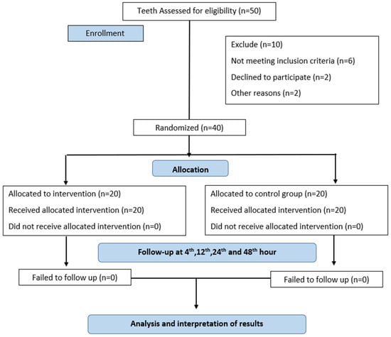 The Institute for Experimental Psychology in Dusseldorf, Germany’s G*Power version 3.1.9.7 for Windows XP was used to determine the sample size. The effect size was determined using the averages and standard deviations from a prior study conducted by Cakici et al. []. Given the significance level of p ≤ 0.05, effect size of 0.9, and study power of 0.8, the anticipated sample size was 40 teeth, with 20 teeth in each group.