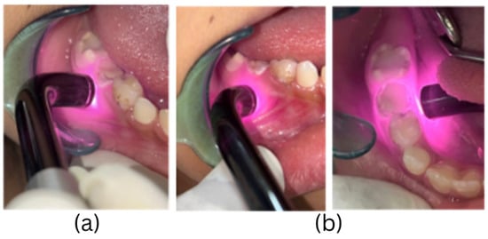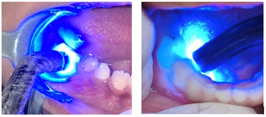 Control group intervention: A blue LED curing light (Woodpecker Cordless LED-C (Guilin Woodpecker Medical Instrument Co., Guilin, China)) of 420–480 nm wavelength was held at the four tooth sites similar to that of the interventional group for the same exposure time of 15 s per site. The curing light had a tip diameter of 12 mm (spot size 1.13 cm2), and this was used in non-contact mode and kept 1 mm away from the tissue (Figure 3). The measured emitted power density was 700 mW/cm2. This was not sufficient to cause photothermal heating of soft tissues during the exposure times used. Additionally, subjects were to raise their hands if warmth or discomfort was felt during the LED light exposure. No subjects did this, nor did they report discomfort from the LED control treatment.