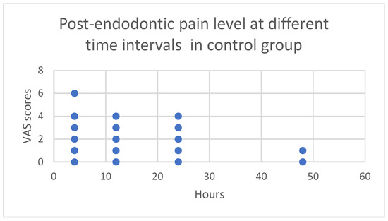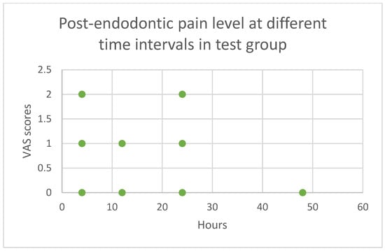 Figure 4 (control group) and Figure 5 (test group) display scatter plots showing the actual data points for the VAS scores at each time point. In the control group, the pain scores ranged from 0 to 6 at the 4th h after post-endodontic treatment. As time progressed, the pain levels gradually decreased, with a median VAS score ranging from 0 to 4 at the 12th and 24th h. By the 48th h, the pain levels had decreased to nearly zero. In the test group, the pain scores remained consistent (ranging from 0 to 2) across all time points and reduced to zero by the 48th h.