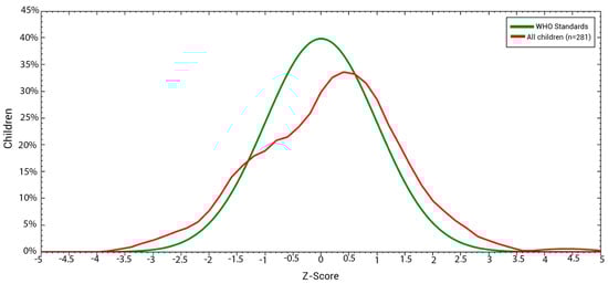 This graph illustrates the overall trend in children’s nutritional status based on the weight-for-age index, comparing it to the reference values set by the WHO standard. Our findings indicate that most children are classified as having a normal nutritional status according to their weight range for their age (Figure 1).