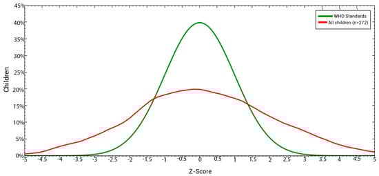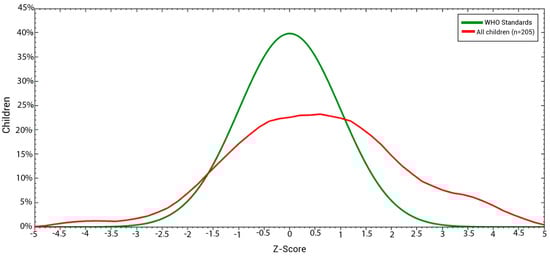 This graph illustrates that the distribution curve of the weight-to-height index for the children in the sample, represented by the red curve, is shifted to the right when compared to the WHO’s reference curve. This indicates that the majority of the children examined showed tendencies towards excessive malnutrition, specifically overweight and obesity (Figure 3).