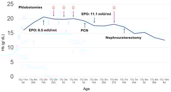 Clinical course of the presented patient with polycythemia. Th patient had gradually elevated hemoglobin (solid line) before visiting the hematologist clinic at 17 years, 2 months, and 22 days old. The hemoglobin level remained high even after several phlebotomies and mildly improved after percutaneous nephrostomy (PCN). The hemoglobin levels further improved after nephroureterectomy and remained stable for 2 months after the operation.