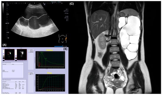Radiographic evaluation of the left kidney revealed hydronephrosis and ureteropelvic junction obstruction. (A) Abdominal ultrasound demonstrated severe hydronephrosis in the left kidney. (B) Renal MAG-3 study indicated poor function of the left kidney, precluding assessment of obstruction. (C) MRI confirmed severe left hydronephrosis with a thinned renal cortex, suggesting ureteropelvic junction obstruction.