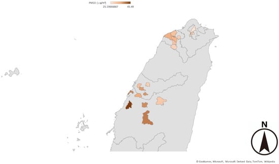 The annual average concentrations of PM2.5 and PM10 should not exceed 5 and 15 mcg/m3, respectively, according to the World Health Organization (WHO) Air Quality guidelines for 2021 [32]. However, the Taiwan Air Quality Standard Law announced on 30 September 2024 that the annual average concentrations of PM2.5 and PM10 should not exceed 12 and 30 mcg/m3, respectively [33]. The PM2.5 annual average during 2017–2022 in all our studied regions did not meet the PM2.5 standard values of the WHO and Taiwan government. Only the cities in Q1 met the PM10 standard value of the Taiwan government, but not the WHO standard. Although most of the studied regions met the PM2.5 and PM10 standard values of the Taiwan government, the top 10% value average could reach twice or even three times the normal standard of the Taiwan government. The abovementioned data indicate that air pollution is still a critical issue in Taiwan.