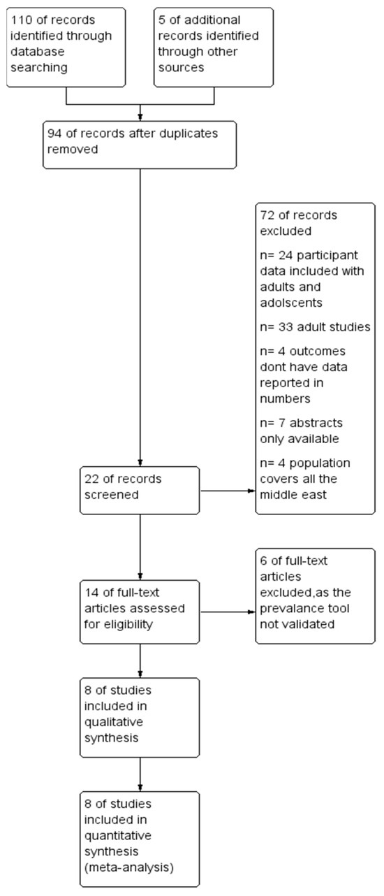 A preliminary search yielded 115 studies from electronic databases. Following the removal of duplicates (21 studies), 94 studies were screened according to the selection criteria based on their titles and abstracts. Twenty-two eligible abstracts were selected for full-text screening. The meta-analysis included eight studies that fulfilled the inclusion criteria. You can see the search process for this study in Figure 1, which is a PRISMA flow diagram [18].