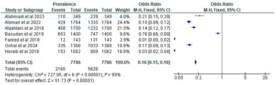 The sensitivity analysis was performed to assess the robustness of the meta-analysis results. Sensitivity analysis involved the exclusion of two studies [21,23] that included participants mixed with adolescents and had a sample size of 143. This exclusion revealed no significant change in the prevalence of asthma, recorded at 0.18 [0.18, 0.19]. Chi-squared statistic = 702.12, degrees of freedom = 6 (p < 0.00001); I-squared = 99%.