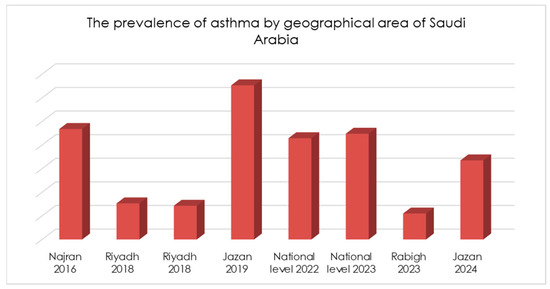Research aimed at determining the prevalence of asthma in Saudi Arabian children has yielded varying results, ranging from 8% to 25% [8]. The study environment, participant characteristics, and the variety of methods employed to assess the incidence of asthma could all be contributing factors to this vast variance in prevalence [9]. Based on how strict each study’s methodology and data-analysis strategy were, the quality of each study likewise varied considerably from the other. Numerous studies conducted in Saudi Arabia have qualitatively evaluated the prevalence of asthma in children, and these evaluations were predicated on different asthma definitions and diagnostic standards [10,11,12].