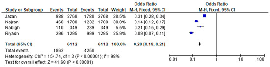 Figure 5 provides a visual representation of Saudi Arabia’s diverse geography, showcasing its 13 provinces and the key cities/regions relevant to this discussion After considering the representation from different provinces, the combined estimate for the prevalence of asthma among children was 0.20 [0.18, 0.21]. The heterogeneity test indicated Chi2 = 154.74, df = 3 (p < 0.00001); I2 = 98%. The forest plot illustrated in Figure 6 represents this estimate. Figure 6 illustrates the aggregated findings of the meta-analysis concerning the prevalence of asthma across different provinces.