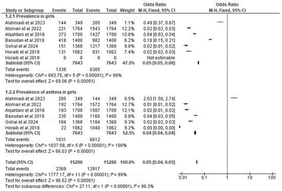All eight studies provided data on the gender-specific prevalence of asthma. The incidence of asthma in school-based studies among boys and girls was 14.16%. Also, 0.05 [0.05, 0.06] Chi2 = 693.75, df = 5 (p < 0.00001); I2 = 99% and 10.91% 0.04 [0.04, 0.04] Chi2 = 1037.58, degrees of freedom = 5 (p < 0.00001); I2 = 100%. The results of this investigation did not reveal any signs of a decrease in heterogeneity within this particular subgroup. As shown in Figure 7, there was not a discernible difference in the severity of heterogeneity between the studies based on the gender of the participants. Based on the findings of this study, Table 3 provides a thorough summary of the data on the prevalence of asthma among children living in Saudi Arabia.