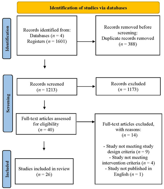 This systematic review included studies that met predefined inclusion and exclusion criteria (See Table 1). The inclusion criteria required that studies (1) be peer-reviewed articles published in English regardless of the country where the studies were conducted, (2) contain any type of digital game-based intervention for substance use or positive development, (3) include randomized controlled trials (RCTs) and non-RCTs that investigated the effects of game-based interventions on substance use and positive development among adolescents, (4) provide all necessary data information (e.g., sample size, odds ratio, 95% CI, or other effect size values), and (5) be rated as “fair” or “good” based on the National Institute of Health (NIH) quality assessment tool [35]. Conversely, exclusion criteria encompass studies that are (1) master’s theses or doctoral dissertations, (2) observational studies (e.g., cross-sectional studies, case-control studies, or (retrospective or prospective) cohort studies), (3) qualitative studies, (4) commentary and editorials, (5) review papers including systematic review and meta-analysis, and (6) unavailability of the full text. Two out of six reviewers independently assessed each article as “yes”, “no”, or “maybe” based on these criteria. Discrepancies in ratings were resolved through discussion to reach a consensus, with oversight provided by the other reviewers. From the first screening stage, 1173 irrelevant records were removed, resulting in 40 articles advancing to full-text review. The application of predetermined criteria resulted in the exclusion of 14 articles, leaving 26 articles for final analysis (See Figure 1).
