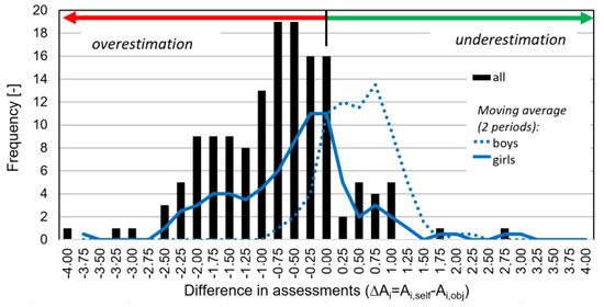 However, equating the two evaluation scales shows a clear contradiction between the objective and subjective evaluation of cycling skills. Children overestimated their cycling skills (in 77% of cases); 40% overestimated their skills by even one grade or more (Figure 1). Interestingly, girls overestimated their cycling skills much more than boys who rather underestimated (mean of deviations from the objective assessment: ∆Agirls = −0.6, ∆Aboys = +0.4).