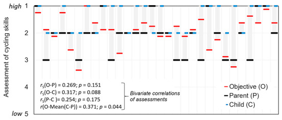 Comparison of children’s cycling skills as observed in the cycle course (O), compared with assessments from children (C) and parents (P), n = 30.