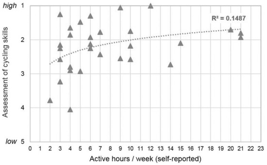 The detailed analysis shows that there is a positive relation between PA and cycling skills of the children: Negative bivariate correlations throughout each skill (r = −0.07 for “left turn” to −0.42 for “braking”) indicate that the higher the reported number of active hours per week, the better the overall cycling skills (roverall = −0.31) (Appendix A, Table A2). As mentioned above, cycling skills were rated following the logic that lower values imply better skills. Figure 3 gives a scatter diagram and a logarithmic trend line on the relation between PA measured with active hours per week and the overall objective assessment of cycling skills. A logarithmic dependency seems to be plausible as above a special threshold, no improvement can be achieved anymore. The results indicate relations in the expected direction but on a very low level. The number of kilometers cycled in the last seven days correlated at a lower level with children’s cycling skills. The mostly negative correlation coefficients indicate that the higher the number of kilometers cycled, the better the objective cycling skill score (Appendix A, Table A2).