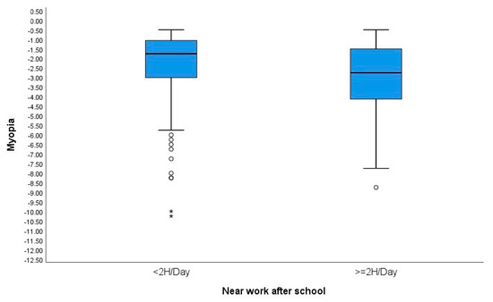 The increased amount of near work as part of education promotes myopia progression. The current evidence supports that the duration and nature of near work as well as visual attitudes (working distance, duration) while performing near work influence myopia progression [12]. Dutheil F. et al. assessed the effects of near work on myopia by conducting a systematic review and meta-analysis, showing that the odds of myopia in the population exposed to near work is increased by 31% in children and by 21% in adults. Interestingly, they also found that there are no significant differences between paper reading and computer work in terms of myopia [40]. In multiple logistic regression analysis, Philipp D. et al. showed that myopia was significantly associated with longer near-work sessions after adjustment for age, sex, and socioeconomic status in German children and adolescents [41]. In this sense, our results agree, showing that children who spent more than 2 h on near work were more myopic than those who spent less than 2 h a day (p = 0.03). Although the mechanisms by which near work dictates myopia progression are not clearly understood, research suggest that a reduction in long-duration near-work activities could protect against increased myopia [12].