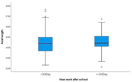 Boxplots showing the relationship between near work after school and axial length (AL). °: outliers (values more than 1.5 box lengths away from the 75th percentile, or less than the 25th percentile).