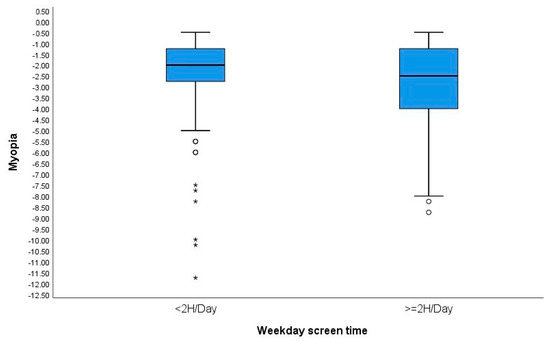 Boxplots showing the relationship between weekday screen time and the magnitude of refractive error (SER). °: outliers (values more than 1.5 box lengths away from the 75th percentile, or less than the 25th percentile). *: extreme cases (values more than 3 box lengths away from the 75th percentile, or less than the 25th percentile).