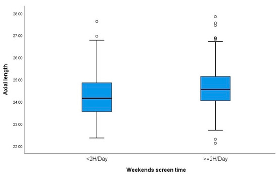 Boxplots showing the relationship between weekend screen time and axial length. °: outliers (values more than 1.5 box lengths away from the 75th percentile, or less than the 25th percentile).