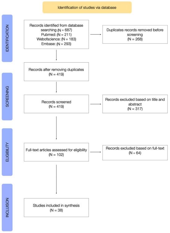 Figure 1 shows the PRISMA-ScR study flowchart describing the different steps of article selection. From the initial database search, 687 papers were identified. After removing duplicates, 419 papers were screened at title and abstract level, and 102 potentially relevant full text articles were selected for eligibility assessment. Finally, 38 publications met the inclusion criteria and were included in the review.