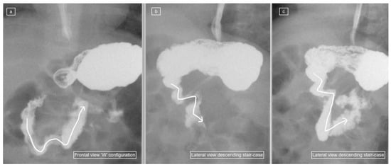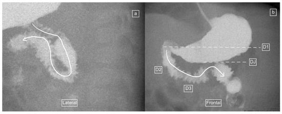The recorded images of the lateral view or cine loops, including the lateral position, were reviewed independently before a review of findings on the frontal (AP) view. Studies were categorized as having ”not captured” or ”inadequately captured” (available but uninterpretable due to inadequate luminal contrast outlining the duodenum on the view) images of the lateral view. We calculated the proportion of studies with adequate lateral views (by excluding the non-captured and inadequately captured cases), and only studies designated to have an adequate lateral view were evaluated further regarding the configuration of the duodenum. This latter subset was then categorized as ”normal”, ”descending staircase”, or abnormal from the lateral view. The descending staircase sign was defined as a stepwise inferior descent of the duodenal course from D1 through D2 oriented posteriorly, after which D3 and D4 ascend in the retroperitoneal position, leading up to the duodeno-jejunal flexure at the same height as D1, before coursing anteriorly (Figure 2, Figure 3 and Figure 4).