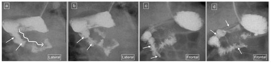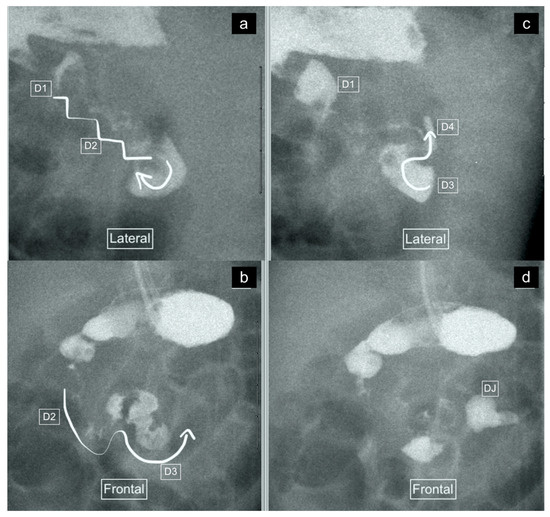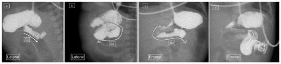 (a–d): UGIS showing an abnormal duodenum in a 12-day-old boy with non-rotation. (a) Lateral view demonstrates a “slope-like” descent of D2 oriented posteriorly. (b) D3 courses anteriorly from this point. (c,d) represent sequential image captures in the frontal view which show the horizontally oriented D3 with an inferior descent rather than a superior ascent to D4. Most of the small bowel was positioned on the right on follow-up images in keeping with non-rotation rather than malrotation.
