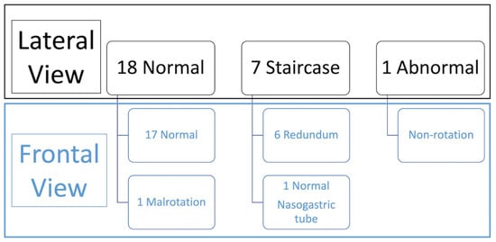 Comparison with the AP view was performed (summarized in Figure 6) which demonstrated 2 abnormal exams (1 malrotation and 1 non-rotation), 6 duodenum redundum and 18 normal studies.