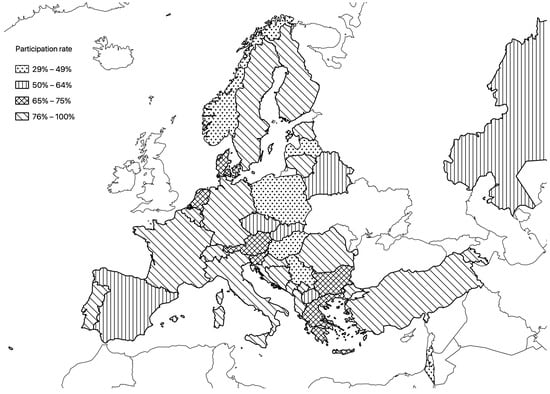 The questionnaire used for the present study is a large cross-sectional electronic survey entitled “European survey on neonatal respiratory care in NICUs” (questionnaire available as Supplementary File S1). The study was submitted to the Ethics Committee of the Azienda Ospedale Università di Padova, which reviewed it and awarded an exemption letter (protocol n. 396n/AO/23), as it did not meet criteria for human-subject research. Research was carried out in line with the principles of the Declaration of Helsinki. The questionnaire was developed by a committee of experts in neonatal pneumology drawn from both the UENPS Scientific Board and the Pulmonology Board of the Italian Society of Neonatology (SIN). A web-based survey was designed following the guidelines set out in the Checklist for Reporting Results of Internet E-Surveys (CHERRIES) []. It comprised 89 questions on neonatal respiratory management. The survey addressed five domains: (A) general information; (B) the modes, devices, and strategies employed in the Delivery Room (DR); (C) the modes, devices, and strategies employed in the NICU; (D) the drugs used in the NICU for neonatal respiratory diseases; and (E) mechanical ventilators in the NICU. The items included multiple-choice, fill-in, and “yes/no” questions. For distribution purposes, the presidents or secretaries of all national neonatal societies involved were emailed by the study coordinator on behalf of the President of UENPS, requesting the list of directors of NICUs at the national level. The directors subsequently received an email invitation containing a unique access link to the web-based survey, powered by SurveyMonkey® (San Mateo, CA, USA). Participants were informed of the aims of the survey and that all responses would be anonymized and encrypted before analysis. Completion of the survey encompassed the informed consent for the respondent’s participation. A reminder was sent to non-responders every 3 weeks, for a maximum of 4 times. After that, non-responders were registered as such. In those countries with a restricted policy, where the national neonatal society was not allowed to share contact information (France, Germany, Spain, The Netherlands, Switzerland, Slovakia, Serbia, Croatia, Montenegro, Belgium, Austria, Denmark), the invitation to participate in the survey was distributed at national level through the national society’s mailing list. Directors who accepted to participate gave their consent by writing their email address on an online contact form set up for that purpose. Participation was completely voluntarily. Invitations to the survey were first sent in February 2022 and were closed by July 2022.