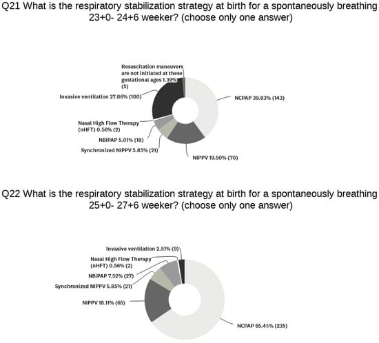 Regarding the setting of the initial FiO2, almost all the units follow either the suggestions set out by the European Resuscitation Council [] (49%) or those of the American Academy of Pediatrics (AAP) and American Heart Association [] (43%), which differ in terms of suggested initial FiO2 for infants < 28 weeks GA. Only a few centers use national guidelines (8%). All the units enrolled in the survey aim at a target SpO2 of ≥80% within 5 min after birth in newborn infants of <28 weeks GA. SpO2 monitoring is performed in 99% of the units and ECG monitoring in 72%; colorimetric capnometry and end-tidal CO2 are employed in only 27% of them. A respiratory function monitor (RFM) is used in 21% of the units. The data on the stabilization of spontaneously breathing premature infants with a GA of 23–24 and 25–26 weeks are reported in Figure 2.