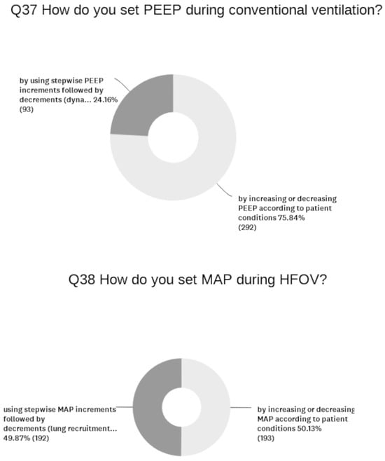 Data in the literature show that around half of newborns of <28 weeks GA require invasive MV []. In addition, around half of these fail their first extubation attempt, thus worsening outcomes []. Regarding invasive ventilation strategies, lung-protective modes such as conventional ventilation + VTV or HFOV should be the first choice for babies with RDS who require MV to avoid over-distension and atelectasis []. Indeed, most of the NICUs follow these recommendations, using SIPPV + VTV as a first choice to treat RDS. Conventional VTV leads to reduced ventilation, fewer air leaks, and a lower incidence of BPD due to the capability of real-time pressure weaning as lung compliance improves []. As reported, when treating high risk infants, one third of the units shift to HFOV and HFOV + VTV as first choices. During weaning, volume-targeted techniques in which all the spontaneous breaths are supported (SIPPV + VTV, SIMV + PSV, PSV + VTV) are correctly [] and largely employed. It is disappointing to observe that, despite following the best evidence on lung protective ventilation, BPD incidence is still so highly varied between the surveyed units. BPD is acknowledged as an abnormal reparative reaction to both prenatal and postnatal damage affecting the developing lungs []. One possible reason for this variability may lie in how closely the various practitioners in a unit follow the guidelines and how well the medical directors of each unit summarized this when responding to the survey on behalf of their fellow clinicians. Another reason is the lack of written policies on ventilation strategies in more than 60% of the NICUs.